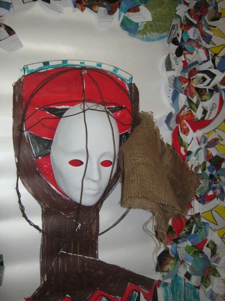 My reworking of EGP’s piece, uses roughly handcut paper flowers made exclusively from several copies of the visitor publication of the Grenada Board of Tourism. These rough flowers more funeral wreath than halo, around the white sheep’s headgear of the ShortKnee – think lamb to slaughter. Originally I was going to handcut paper doilies white on white to create the halo effect with which EGP surrounds her heads, but realised that using the BOT’s publication made more sense, given that 2012 is the carnival Year of the ShortKnee. Its tag line Legacy of the Chantuelle, does not really hold much water at time of writing this blog, as it is this artist’s opinion that the ShortKnee history and image have not been fully explored as a true icon of our visual and historical culture, from a tourism of educational standpoint.