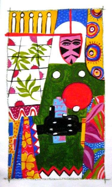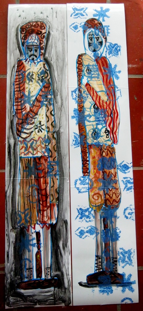 The text to Ras Akyem-I Ramsay’s 1995 work, titled Moses in Art in the Caribbean, An Introduction (Walmsley and Greaves) states that Moses is a key figure in the Rastafarianism, Christianity, Jewish and Islamic religions. As we know from schooldays, Moses resorted to extreme measures when his many attempts to get the Egyptian Pharaoh to voluntarily release him and his people from bondage, and to let them find their promised land, went unheeded. In preparing my translation of Ramsay’s work, I came across pencil sketches I had done during a visit to the exhibit ‘The Secrets of Tomb 10A, Egypt 2000 BC’ at the Museum of Fine Arts Boston some years ago. The collection of shabti – small funerary statues which the ancient Egyptians believed would perform work for them in the afterlife, carpenters, soldiers, brick makers, people engaged in work in granaries, bakeries and breweries, oxen plowing a field and more – was made for the burial of a local governor, reflecting in wooden miniature everyday life on his estate. A Pharaoh-like statue inspired these two ShortKnee Pharaoh-like pieces, done in blue marker, acrylic paint wash, and overlaid with blue Adinkra stencils used to represent (i) independence, freedom, emancipation (ii) law and justice, slavery and captivity (iii) wisdom, creativity (iv) initiative, dynamism and versatility and (v) time change.